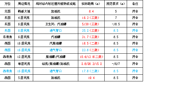 西面:有兩棟樓房,其中靠中部為一棟單層民房,距離最近的0#柴油罐28.3m,距離汽油加油機(jī)15.2m,靠北端為一棟6層民房,距離相鄰加油機(jī)為19.4m。